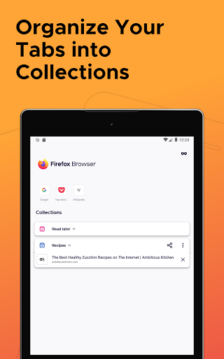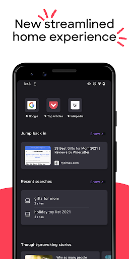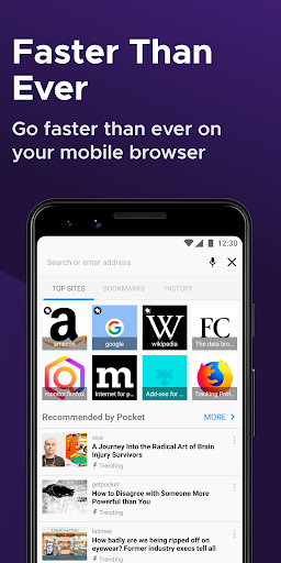 ✔ FIREFOX HOME SCREEN• Access your recent bookmarks and top sites and see popular articles from across the internet, recommended by Pocket, which is part of Mozilla.