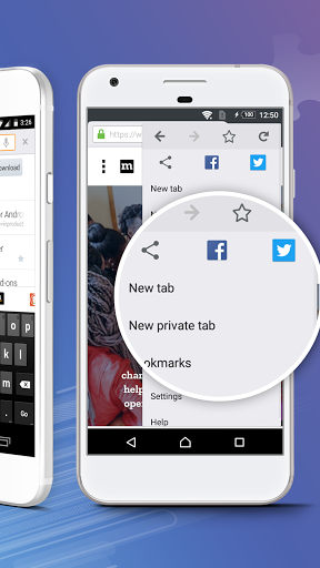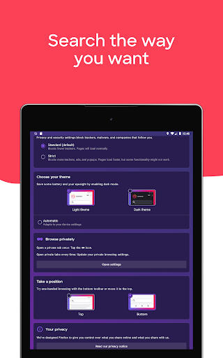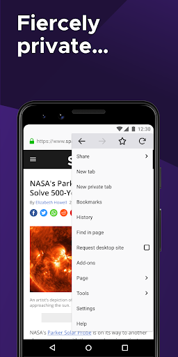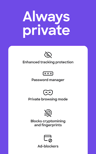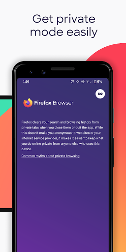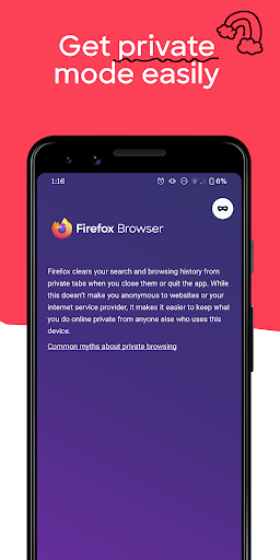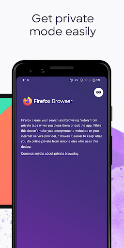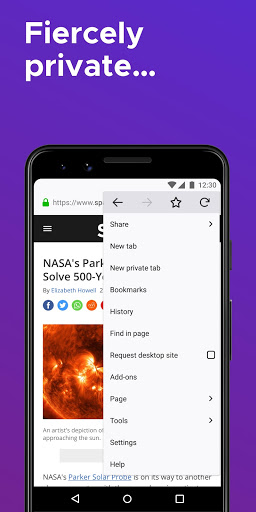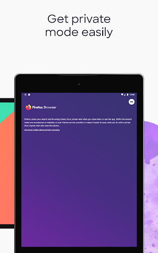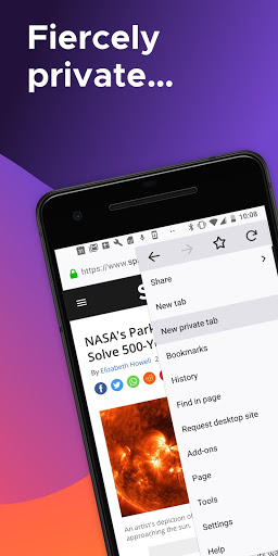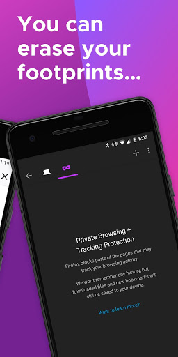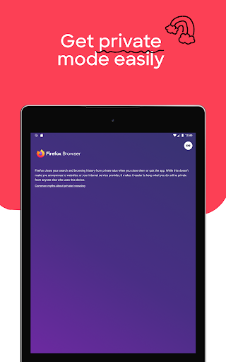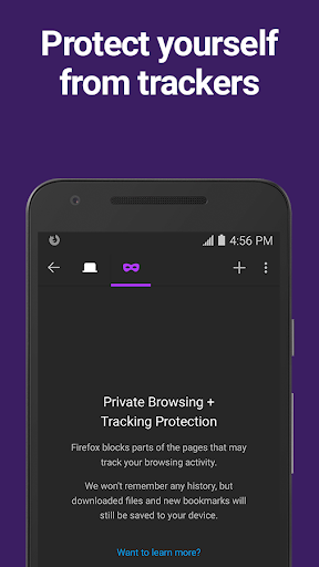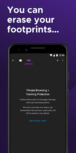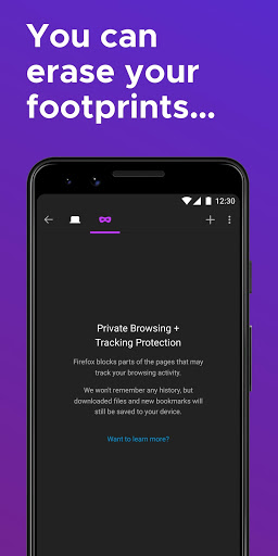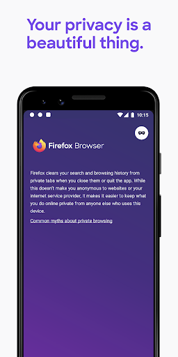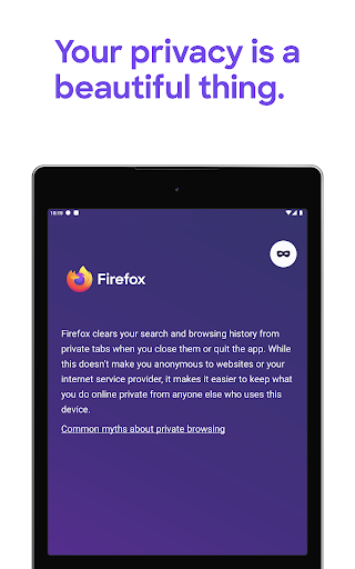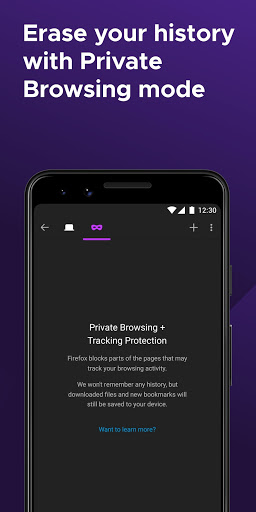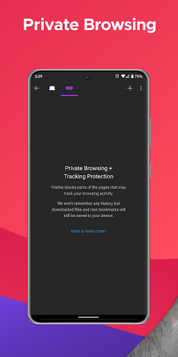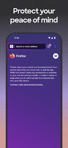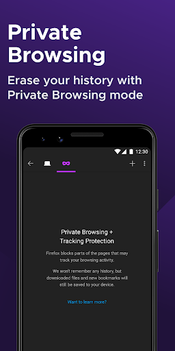 • Private browser mode — Search in a private tab, and your browsing history is automatically deleted from your device when you close Firefox.
