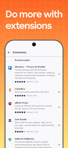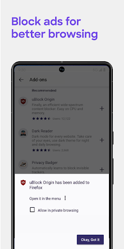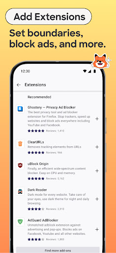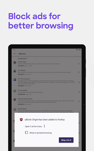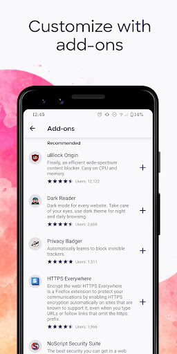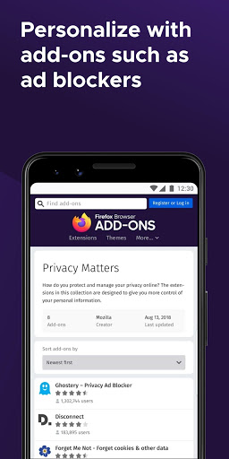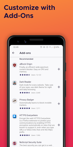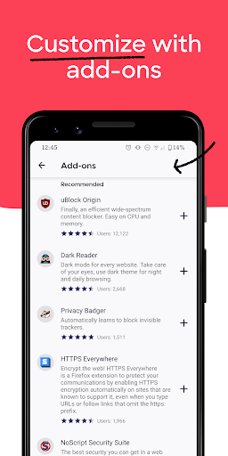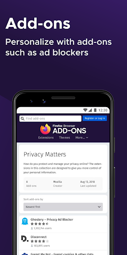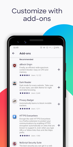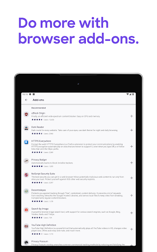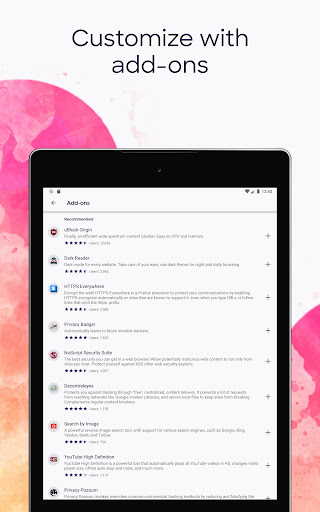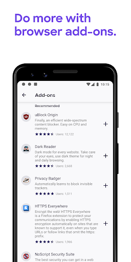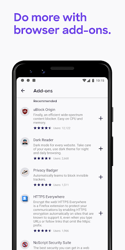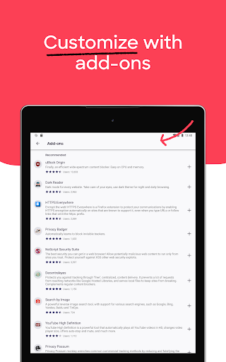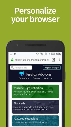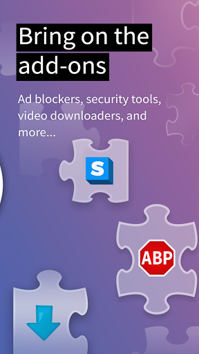 GET ADD-ONS FOR EVERYTHING- Take control of your mobile browser by personalizing Firefox with add-ons like ad blockers, password and download managers and more. Want a more personalized browser? Add-ons can help you customize your browser to make your time online safer.