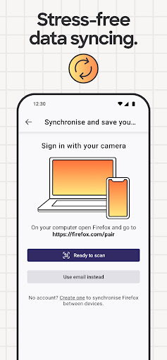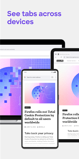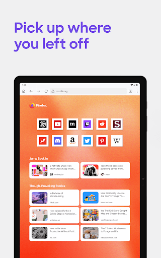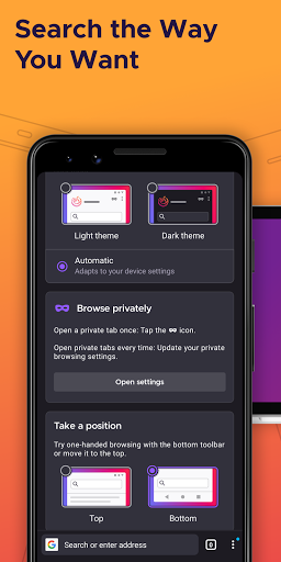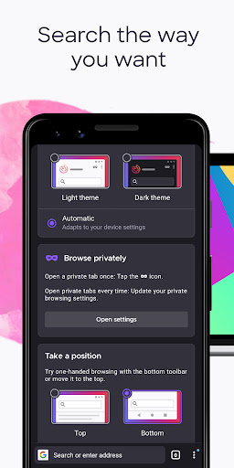 You can move the search bar to the top or bottom of the screen for easier one-handed browsing. Sign in to your Mozilla account to sync tabs, bookmarks, passwords, and browsing history across devices, so switching feels seamless.