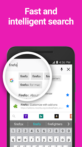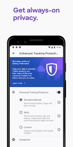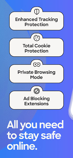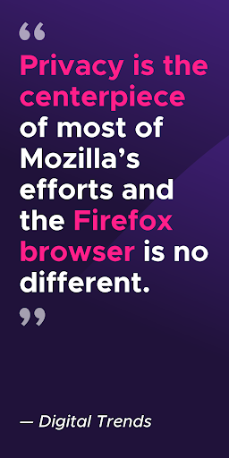 FAST. PRIVATE. SAFE.Firefox for Android browser gives you effortless privacy protection with lighting-fast page loads. Enhanced Tracking Protection automatically blocks over 2000 known online trackers from invading your privacy and slowing down your pages. Firefox browser also introduces a clean new design that makes it easier to get more things done, more quickly. Plus, with smart browsing features built in, Firefox lets you take your privacy, passwords, and bookmarks with you safely wherever you go.