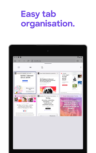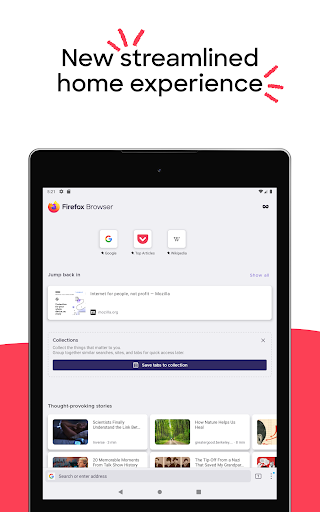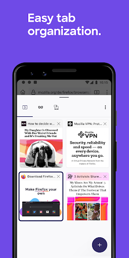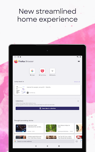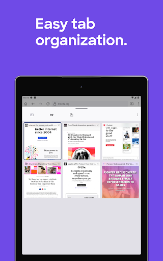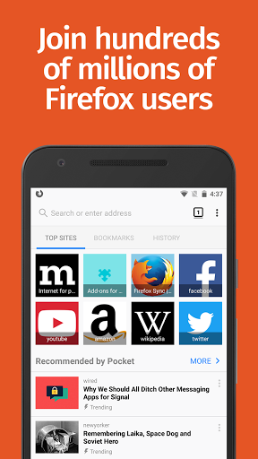 Our latest version of Firefox gives you the ability to see your open tabs and favorite sites all in one place. The new Firefox home screen adapts to you. The more you use it, the smarter it gets. Firefox makes it easier for you to pick up right where you left off. Plus Firefox Android has even more industry-leading privacy and security from the most trusted name in tech