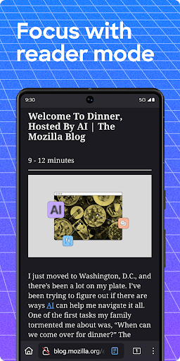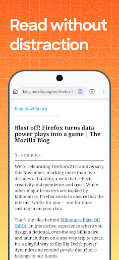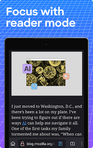 Focus on what mattersThe web can be distracting. Firefox is designed to help you stay focused without making you manage everything yourself. Reader Mode clears clutter from articles, and picture-in-picture keeps videos visible while you multitask—without pulling focus from what you're doing.