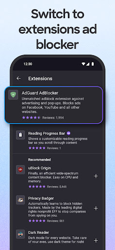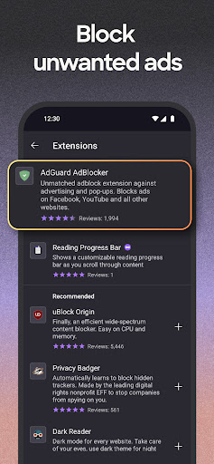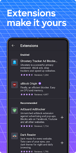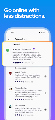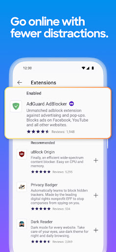 • Get helpful add-on extensions, including ad blockers, block certain web pages, turbo-charge privacy settings and more with our private browser.