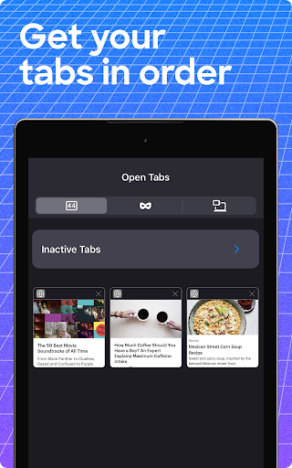 • See your open tabs as thumbnails or a list view.
