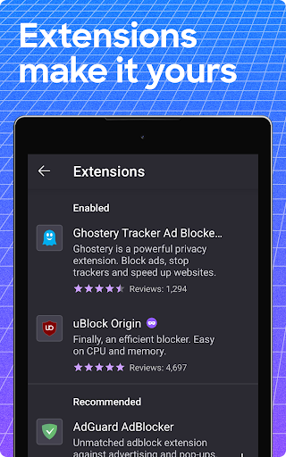 ✔ Extensions – Add supported extensions like ad blockers and privacy tools to customize how you browse.