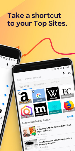 ✔ FIREFOX HOME SCREEN• Access your recent bookmarks, top sites and see popular articles from across the internet, recommended by Pocket, which is part of Mozilla.