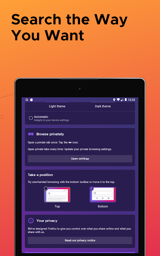 FIREFOX WEB BROWSER SEARCH WIDGETNo need to open the app. Search the web directly from your device’s home screen. Add the Firefox for Android browser search widget and get instant results without the extra taps.