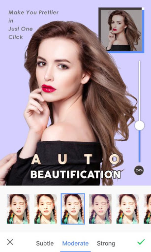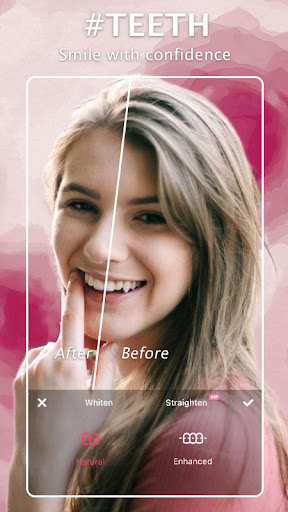 •Select the beautification level of your choice •Get flawless skin, sparkly eyes, a straighter nose, whiter teeth, etc. in just ONE tap!