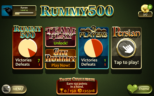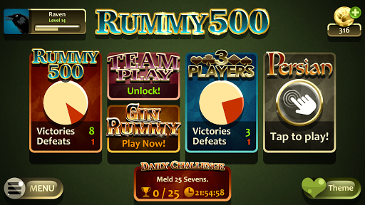 • 6 game modes: Regular, 3-Player, Speed Rummy, Team Play, Persian and Dealer's Gambit.