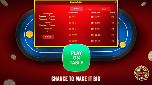 In SuperStar Teen Patti, chips have no real cash value. Superstar teen patti doesn’t involve any real gambling. It is completely free. If you lose your chips, you can buy more chips. This game is intended for adults & don’t offer real money gambling or any opportunity to win real money/prizes. Any success in Superstar Teen Patti is not indicative of future success at real money gambling.