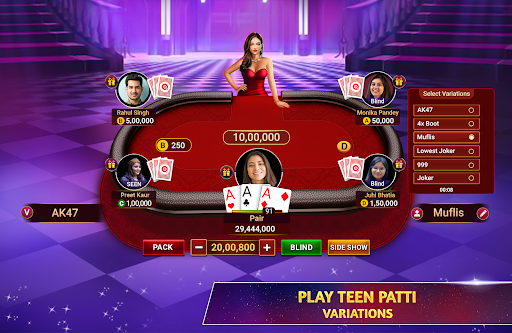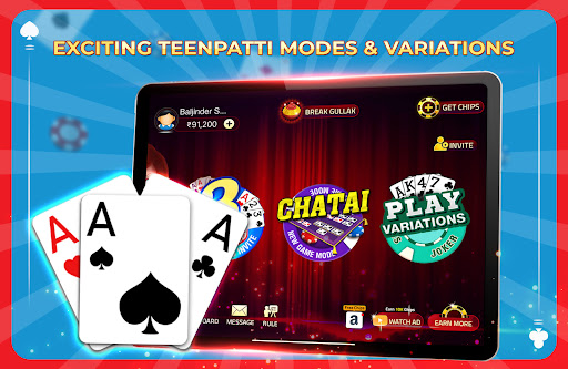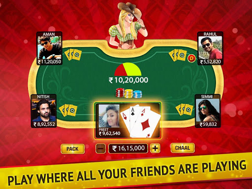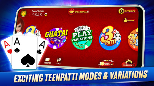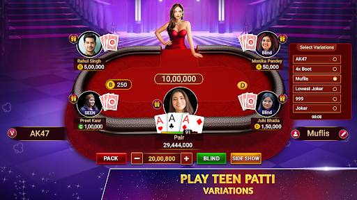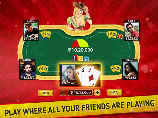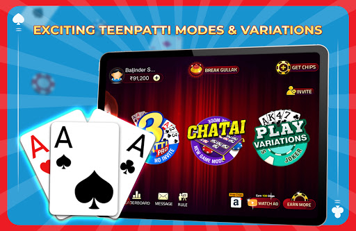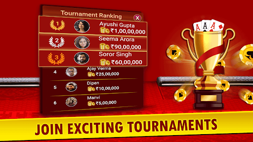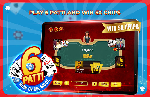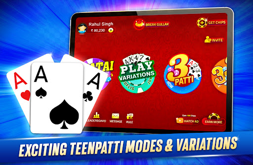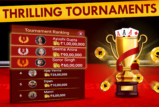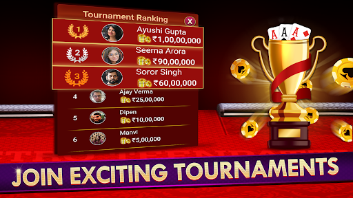 Join millions of players playing real-time Teen Patti (Indian Rummy), Chatai, 6 Patti, 3 Patti, AK47, Tourneys