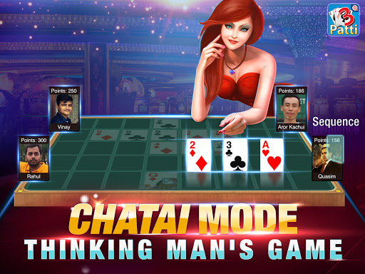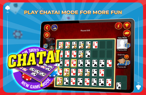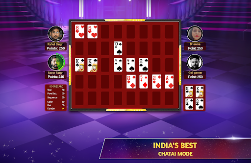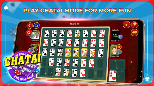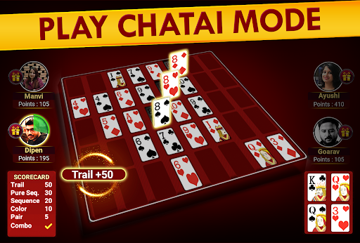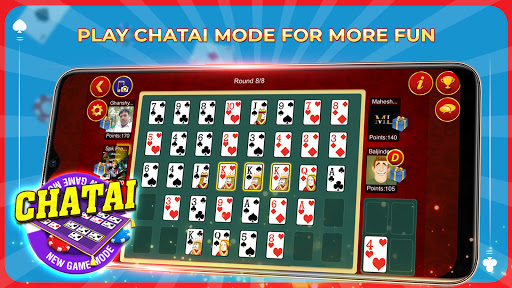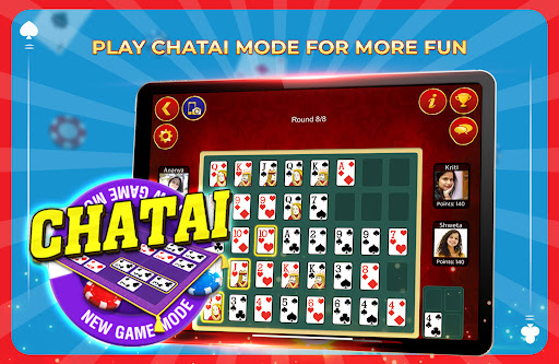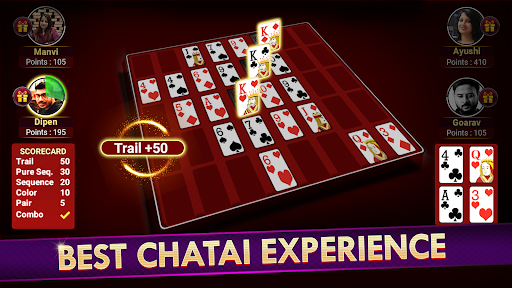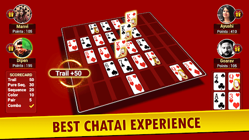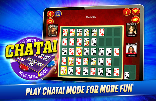 INTRODUCING NEW GAME MODE CHATAIPlay Teen Patti in a more fun way like never before. Make your best teen patti combinations on grid and earn points. Try to make multiple combinations in a round and earn combo points. Player with maximum points win the tournament.