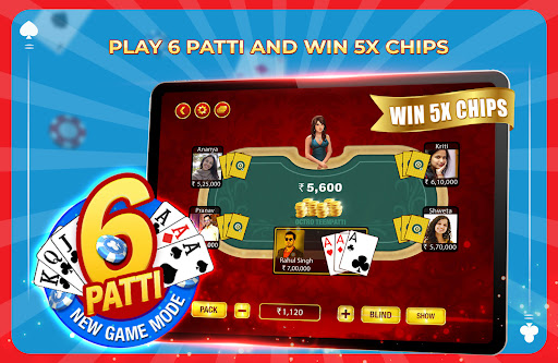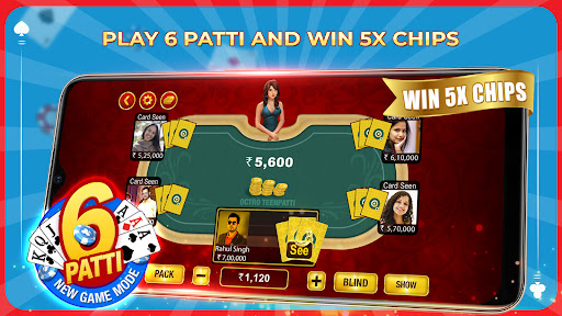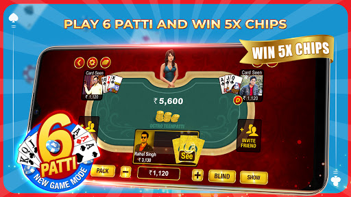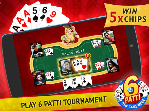6 PATTI : It’s a game of strategy. 6 Patti is a tournament mode where 15 hands are played between 5 players. Winnings are 5 times the stakes.