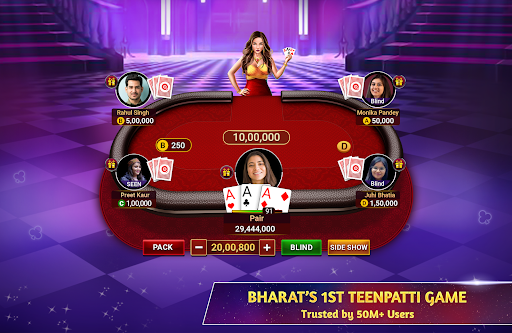 **Join millions of players playing real-time Teenpatti (Indian Rummy), Chatai, 6 Patti, AK47, Tourney’s!**Install Now & Get Welcome Bonus up to 1 Million Free Chips*