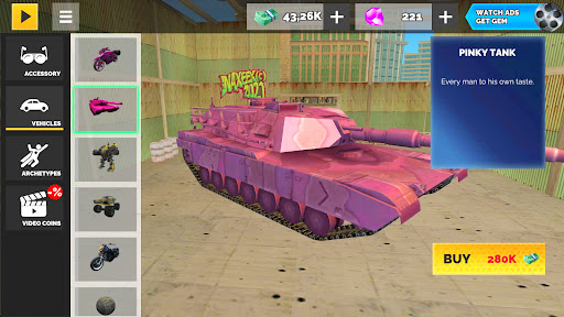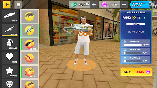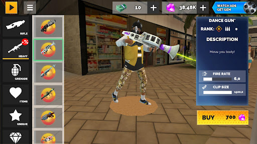 Make sure to visit the in-game shop, to find all the tools you need to climb the top of the criminal world. Get yourself an arsenal of melee weapons and guns, ranging from classic pistols and SMGs to fantastic blasters. Drive through the city using a wide choice of cars and bikes, or fly across skyscrapers on a plane. If you want to achieve even more battle power you can buy a combat helicopter or a mighty mech.